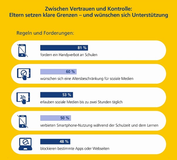 Weitgehende Einigkeit herrscht in einer zentralen Frage: 81 Prozent aller Eltern befürworten ein Handyverbot an Schulen. Fast die Hälfte der Befragten mit Nachwuchs glaubt, dass Handys im Klassenzimmer die Konzentration und den Unterricht stören. Knapp ein Drittel hält ein Handyverbot für sinnvoll, möchte aber für bestimmte Situationen Ausnahmen gestatten. Darüber hinaus fordern die Eltern klare Altersgrenzen für den Zugang zu sozialen Medien: Hier halten 60 Prozent eine Altersbeschränkung für notwendig, unabhängig davon, um welchen Dienst es sich handelt: „Viele Eltern sehen den Lernerfolg ihrer Kinder wegen fehlender Konzentrationsfähigkeit in Gefahr, deshalb wünschen sie sich auch offiziell klare Regeln und Schutzräume“, sagt der Digitalexperte Thomas Brosch.